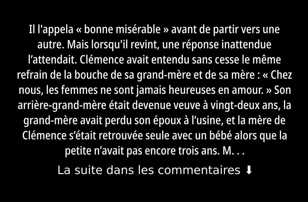Clémence avait entendu sans cesse le même refrain de la bouche de sa grand-mère et de sa mère : « Chez nous, les femmes ne sont jamais heureuses en amour. » Son arrière-grand-mère était devenue veuve à vingt-deux ans, la grand-mère avait perdu son époux à lusine, et la mère de Clémence sétait retrouvée seule avec un bébé alors que la petite navait pas encore trois ans. Même si elle ne croyait pas vraiment aux malédictions, au fond delle, elle pensait parfois que son amour finirait aussi en tourments. Contre toute logique, Clémence espérait malgré tout un foyer, un mari, des enfants.