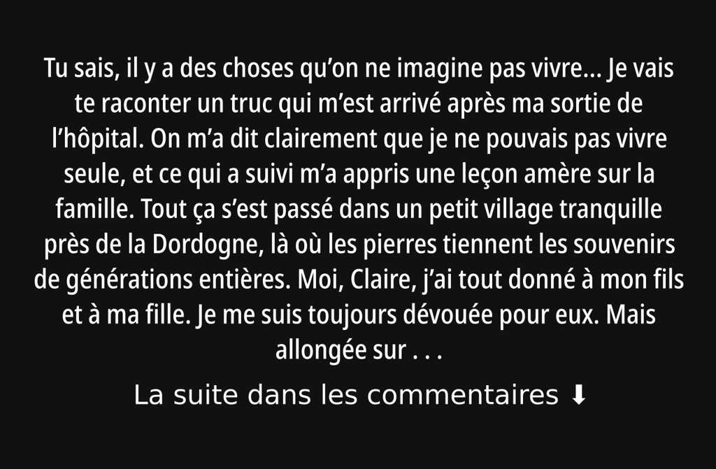Tout ça sest passé dans un petit village tranquille près de la Dordogne, là où les pierres tiennent les souvenirs de générations entières. Moi, Claire, jai tout donné à mon fils et à ma fille. Je me suis toujours dévouée pour eux. Mais allongée sur ce lit dhôpital, jai réalisé une vérité glaciale : ceux pour qui jai sacrifié ma vie mont tournée le dos. Ça ma brisée, mais ça ma aussi ouvert les yeux sur ceux qui tiennent vraiment à moi.