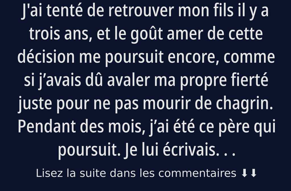 J’ai tenté de retrouver mon fils il y a trois ans, et le goût amer de cette décision me poursuit encore, comme si javais dû avaler ma propre fierté juste pour ne pas mourir de chagrin. Pendant des mois, jai été ce père qui poursuit. Je lui écrivais des messages qui restaient “lus”. Jappelais, et son téléphone sonnait puis finissait par séteindre. Je laissais des messages vocaux, la gorge serrée, le suppliant pour cinq minutes cinq seulement afin de comprendre quand et pourquoi il mavait rayé de sa vie. Je me couchais tard, ressassant mes erreurs passées : quand, enfant, ma main se levait avec reproche, quand je rentrais épuisé de latelier et que je refusais découter, quand je promettais dêtre là, sans y parvenir. Avec une honte silencieuse, je me demandais si ce nétait pas moi qui avais brisé ce que je voulais tant préserver.