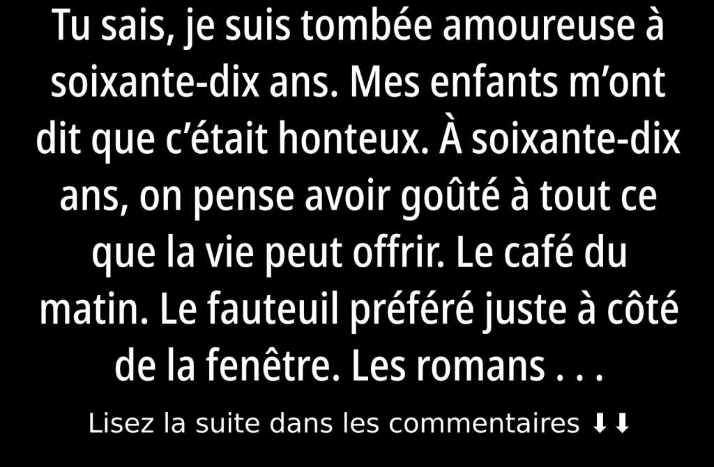 À soixante-dix ans, on pense avoir goûté à tout ce que la vie peut offrir. Le café du matin. Le fauteuil préféré juste à côté de la fenêtre. Les romans quon relit trois fois, parce que la mémoire nest plus ce quelle était. Le silence, surtout, celui qui sinstalle après quarante ans de mariage, quand lun des deux sen va.