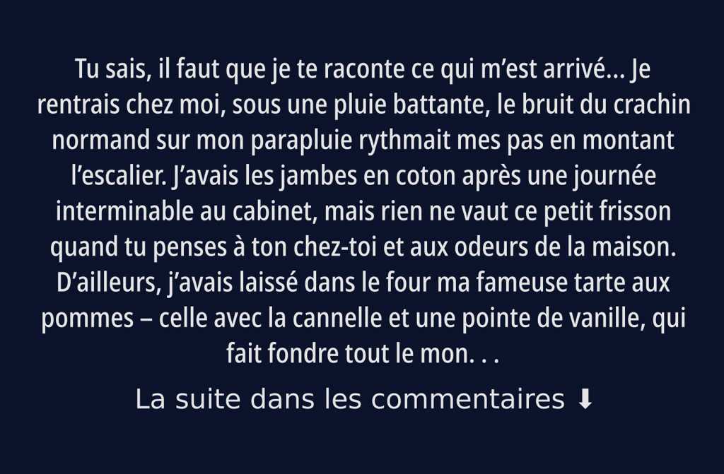 Tu sais, il faut que je te raconte ce qui mest arrivé Je rentrais chez moi, sous une pluie battante, le bruit du crachin normand sur mon parapluie rythmait mes pas en montant lescalier. Javais les jambes en coton après une journée interminable au cabinet, mais rien ne vaut ce petit frisson quand tu penses à ton chez-toi et aux odeurs de la maison. Dailleurs, javais laissé dans le four ma fameuse tarte aux pommes celle avec la cannelle et une pointe de vanille, qui fait fondre tout le monde. Laurent devait la sortir en rentrant du travail.
