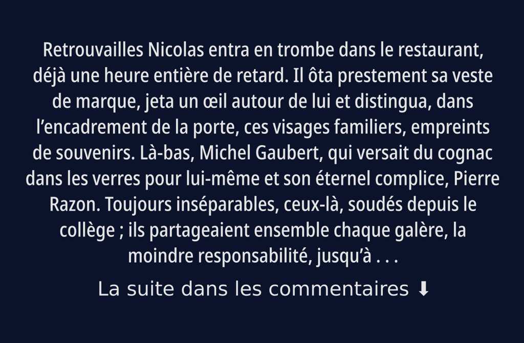 Nicolas entra en trombe dans le restaurant, déjà une heure entière de retard. Il ôta prestement sa veste de marque, jeta un œil autour de lui et distingua, dans lencadrement de la porte, ces visages familiers, empreints de souvenirs. Là-bas, Michel Gaubert, qui versait du cognac dans les verres pour lui-même et son éternel complice, Pierre Razon. Toujours inséparables, ceux-là, soudés depuis le collège ; ils partageaient ensemble chaque galère, la moindre responsabilité, jusquà la dernière miette de baguette. Même sous les drapeaux, ils étaient dans la même unité, rentrés le même jour au pays. Une amitié rare et solide, de celles qui imposent le respect. On racontait quils avaient ouvert ensemble un garage à Courbevoie. Deux bons vivants, mais de sacrés buveurs.