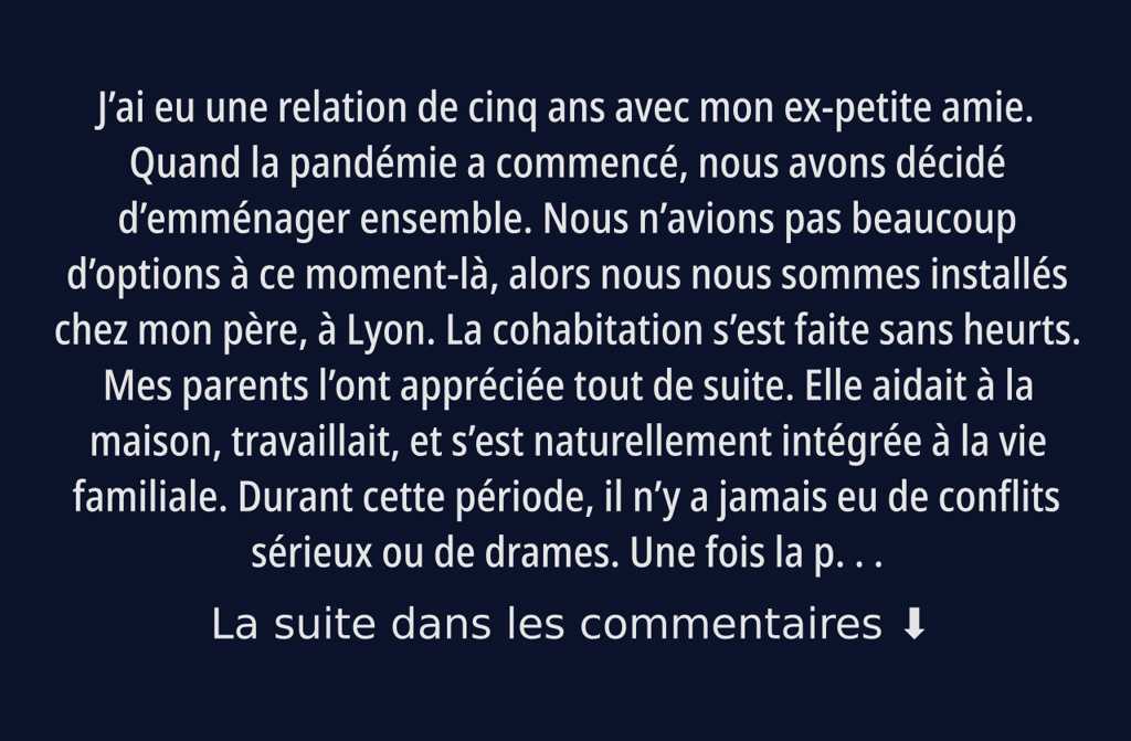 Jai eu une relation de cinq ans avec mon ex-petite amie. Quand la pandémie a commencé, nous avons décidé demménager ensemble. Nous navions pas beaucoup doptions à ce moment-là, alors nous nous sommes installés chez mon père, à Lyon. La cohabitation sest faite sans heurts. Mes parents lont appréciée tout de suite. Elle aidait à la maison, travaillait, et sest naturellement intégrée à la vie familiale. Durant cette période, il ny a jamais eu de conflits sérieux ou de drames.