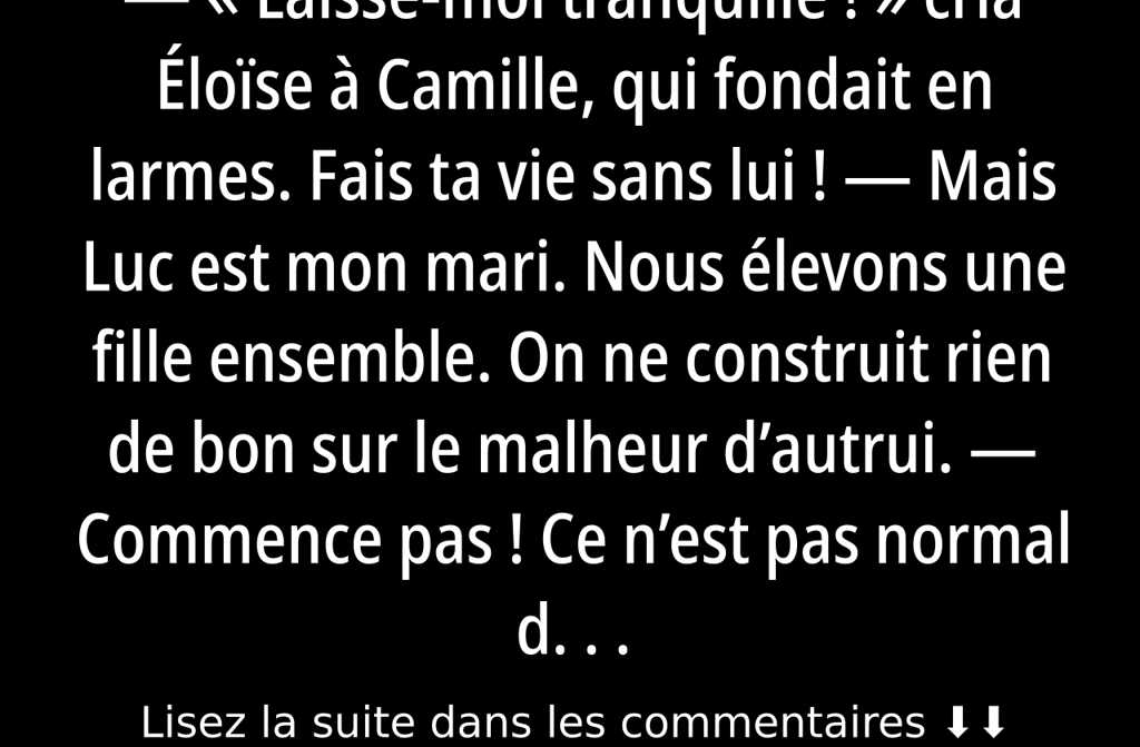 Éloïse sest alors retournée et est partie, le dos droit, déterminée. Ce soir-là, Luc prit sa décision : il emballa ses affaires et quitta Camille. Camille le supplia de ne rien faire dirréfléchi. Mais il était résolu. Elle voulut comprendre en quoi sa rivale, Éloïse, était meilleure quelle.